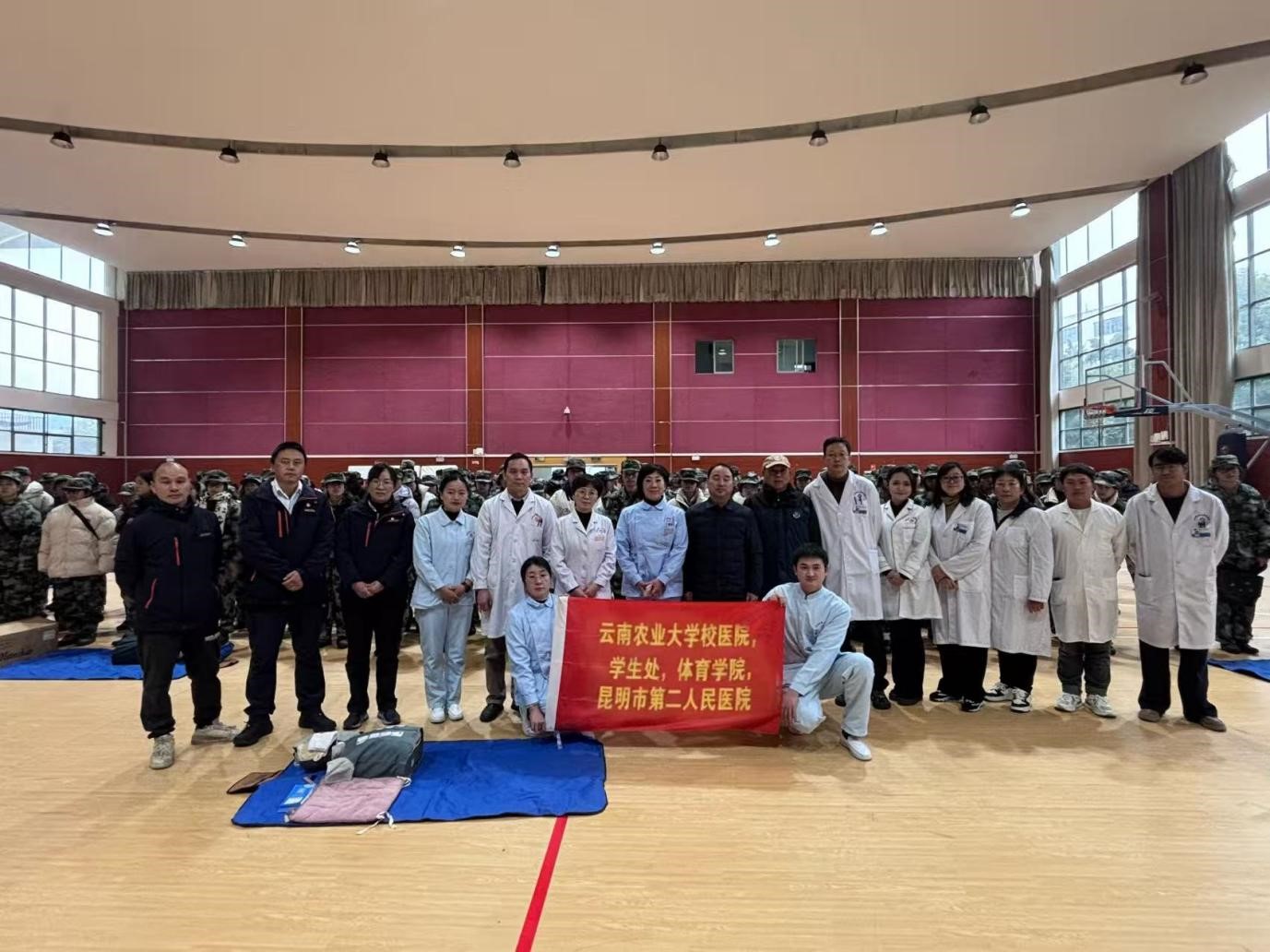 为切实提升学校学生应急处置能力,筑牢校园安全防护网,2025年12月25日,校医院联合昆明市第二人民医院、学校学生处、武装部、体育学院共同举办2025级新生急救技能培训。本次培训以“强化急救技能,护航青春军训”为宗旨,通过多单位资源共享、优势互补,为军训学生骨干量身打造专业化急救培训课程。培训大会由后勤保障服务中心王子健副书记主持。