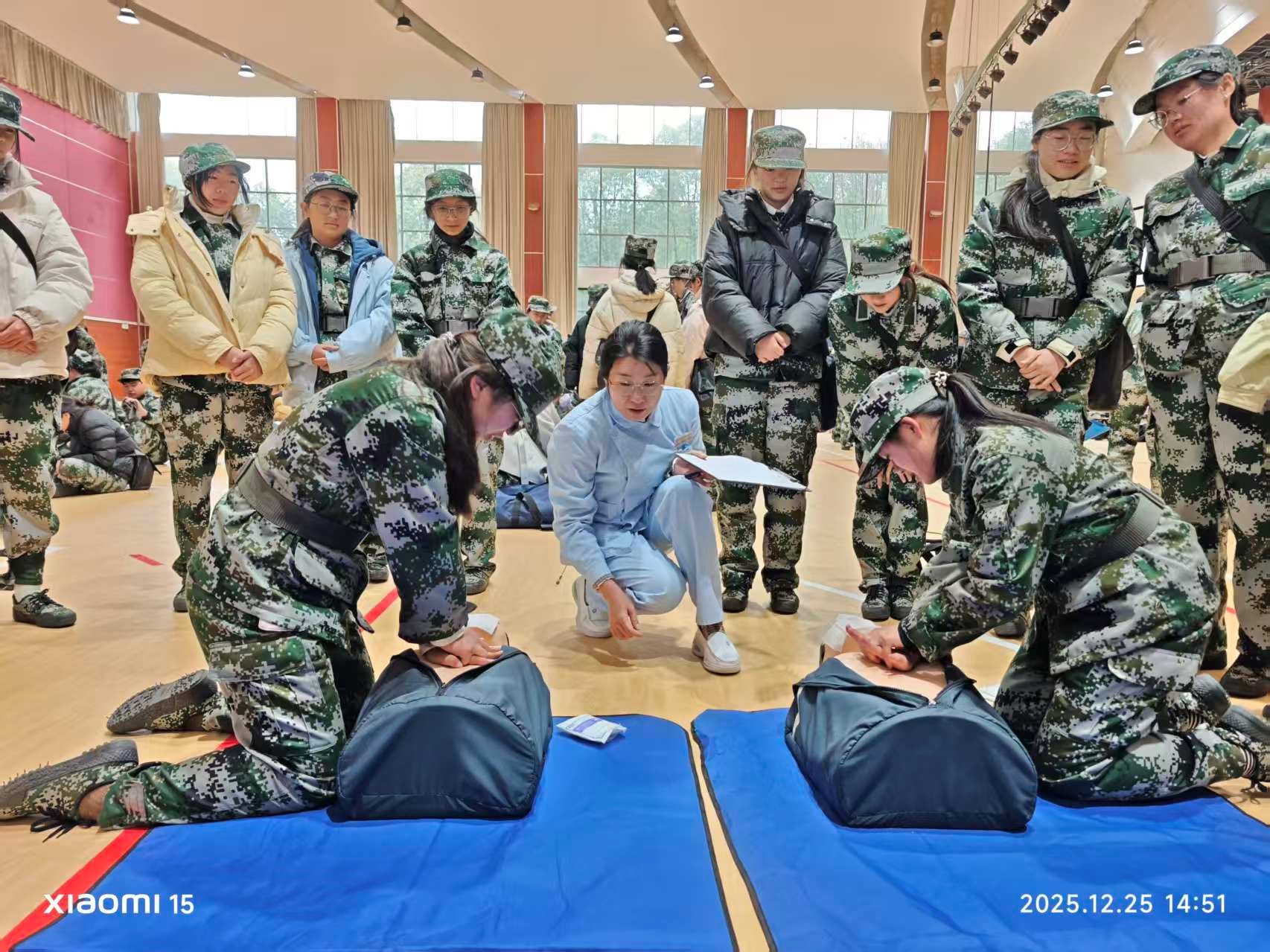 本次培训由昆明市第二人民医院急诊科主任胡琴带队授课,校医院急救培训团队协助,两家医疗团队结合军训场景特点,采用“理论讲解+实操演示”的经典模式,系统传授心肺复苏(CPR)、AED装置使用等核心技能。讲师们通过模拟人实操示范、关键动作拆解、现场纠错指导等方式,帮助参训学生骨干快速掌握操作要领,确保技能培训“入脑入心”。参训的军训学生骨干们热情高涨,在分组练习中反复打磨动作细节,现场学习氛围浓厚。